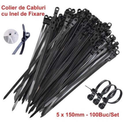 Colier de Plastic Negru 5 x 150mm, cu Cap Montabil – 100b/Set
