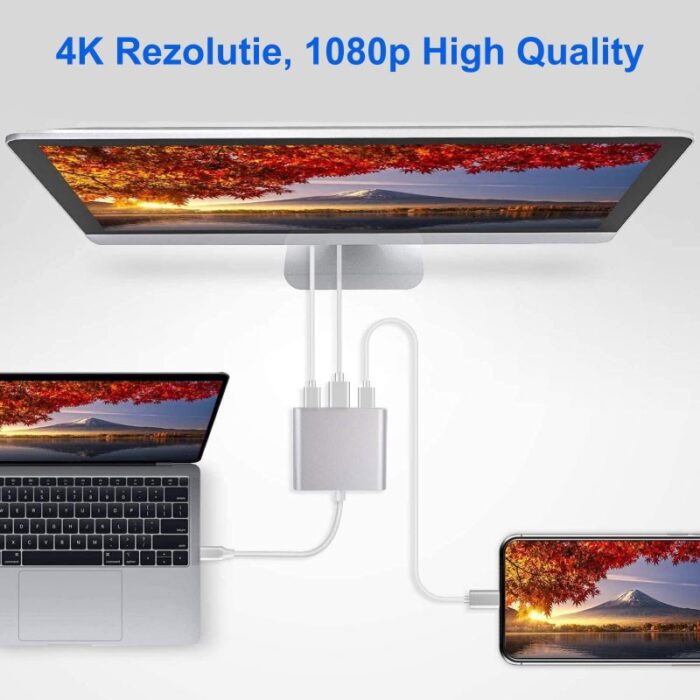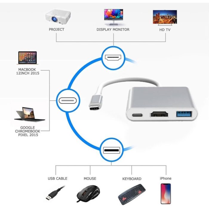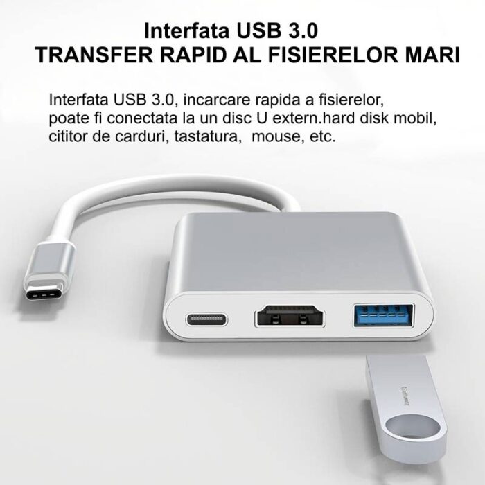 Adaptorul video USB Tip C la HDMI 4K, USB 3.0 și USB Tip C este un dispozitiv versatil și compact,