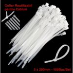 1 x Colier de Plastic Alb 5 x 200mm, Reutilizabil – 100b/Set