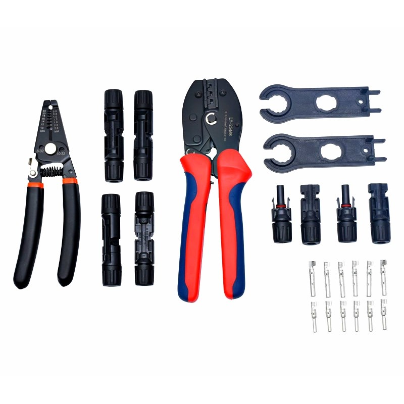 Trusă profesională completă pentru realizarea conexiunilor rapide și sigure în sistemele fotovoltaice. Acest set include toate instrumentele și componentele necesare pentru montarea și întreținerea conexiunilor MC4, asigurând o instalare eficientă și de încredere a panourilor solare.